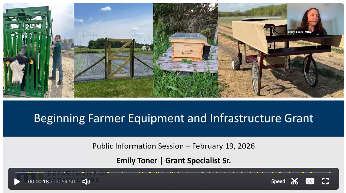 For questions on the grant program or application, submit them in writing before 4 p.m. CT on Tuesday, March 19, 2026, to MDA grant specialist Emily Toner at beginning.farmer.grant.mda@state.mn.us.