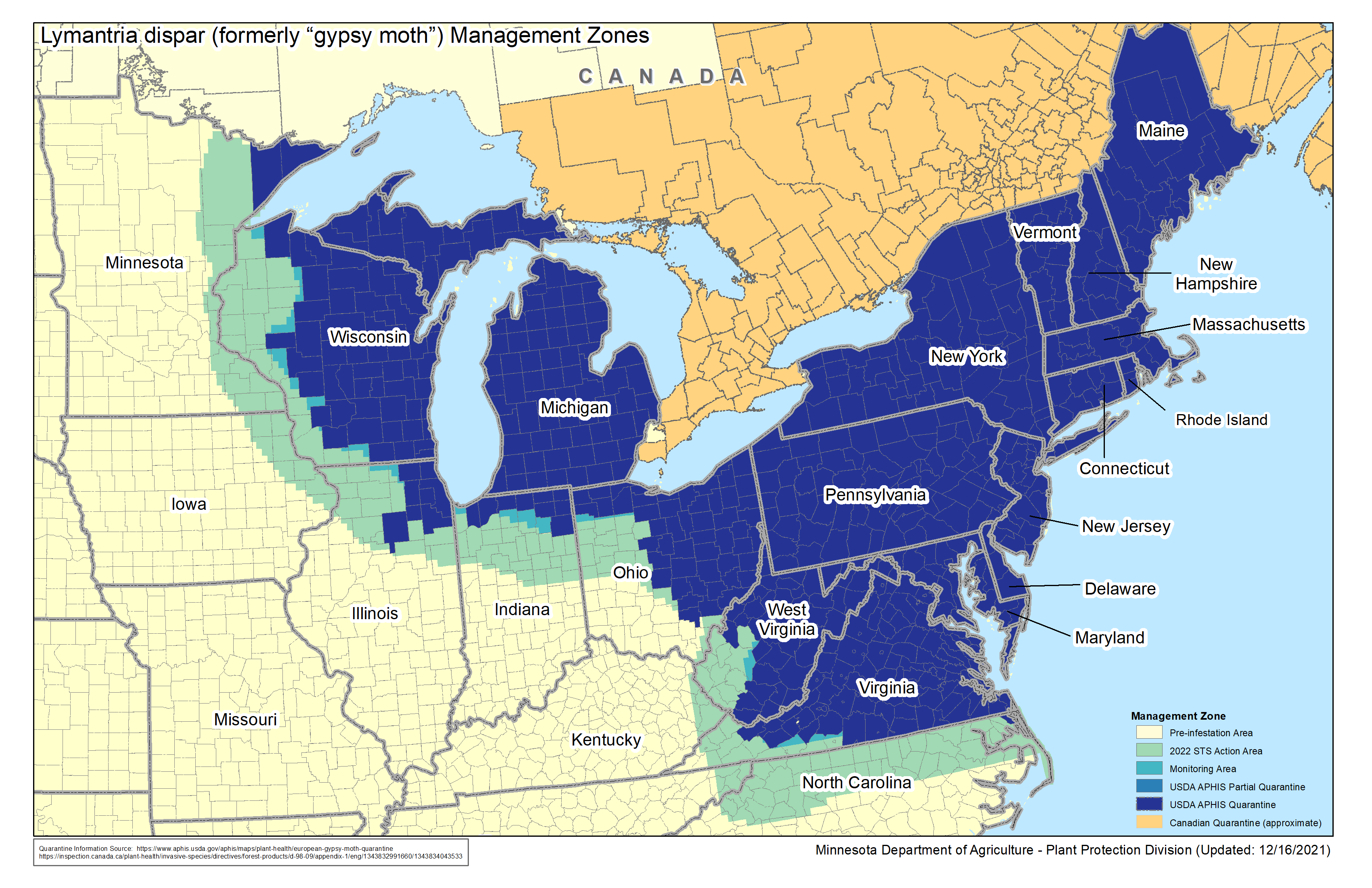 The spongy moth is regulated federally and in the state of Minnesota. Lake and Cook counties are quarantined for spongy moth. For more information visit the USDA’s interactive spongy moth quarantine map.