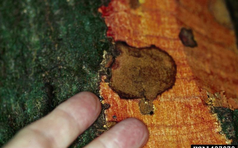 In oak trees, Phytophthora ramorum infects the main trunk of mature trees. This infection causes a “bleeding” canker in which wood and bark turn reddish brown, and red liquid seeps out from cracks in the bark. The pathogen destroys the tissue that transports food and water throughout the tree. When most of the trunk is infected, leaves quickly turn brown and the tree dies.